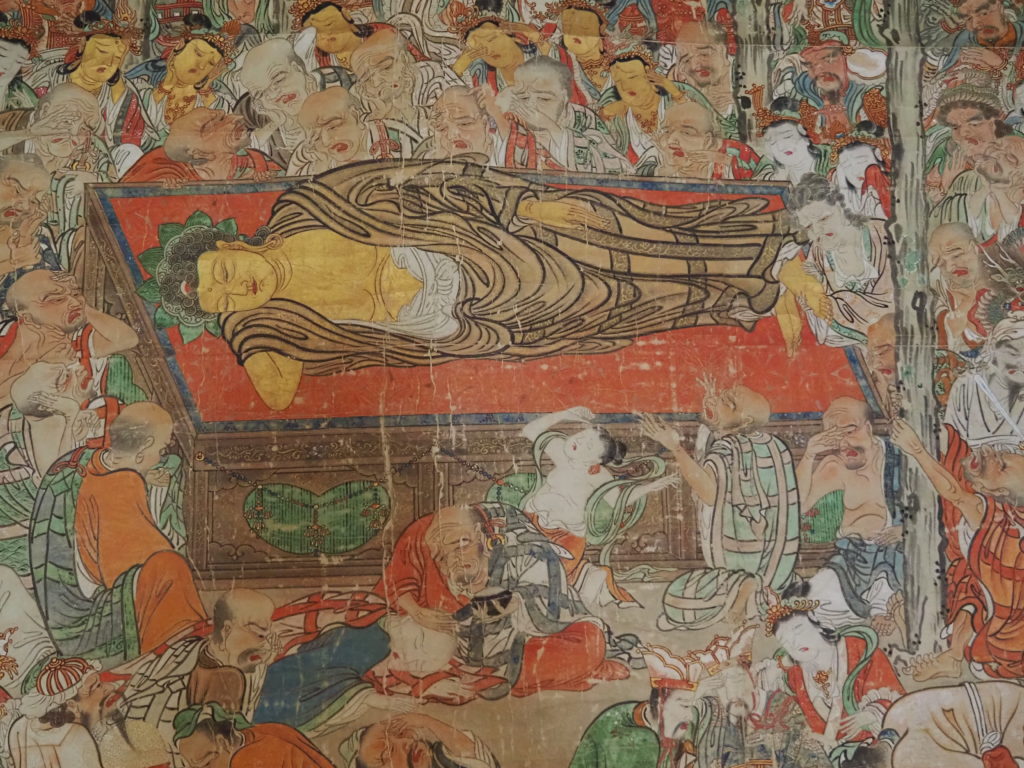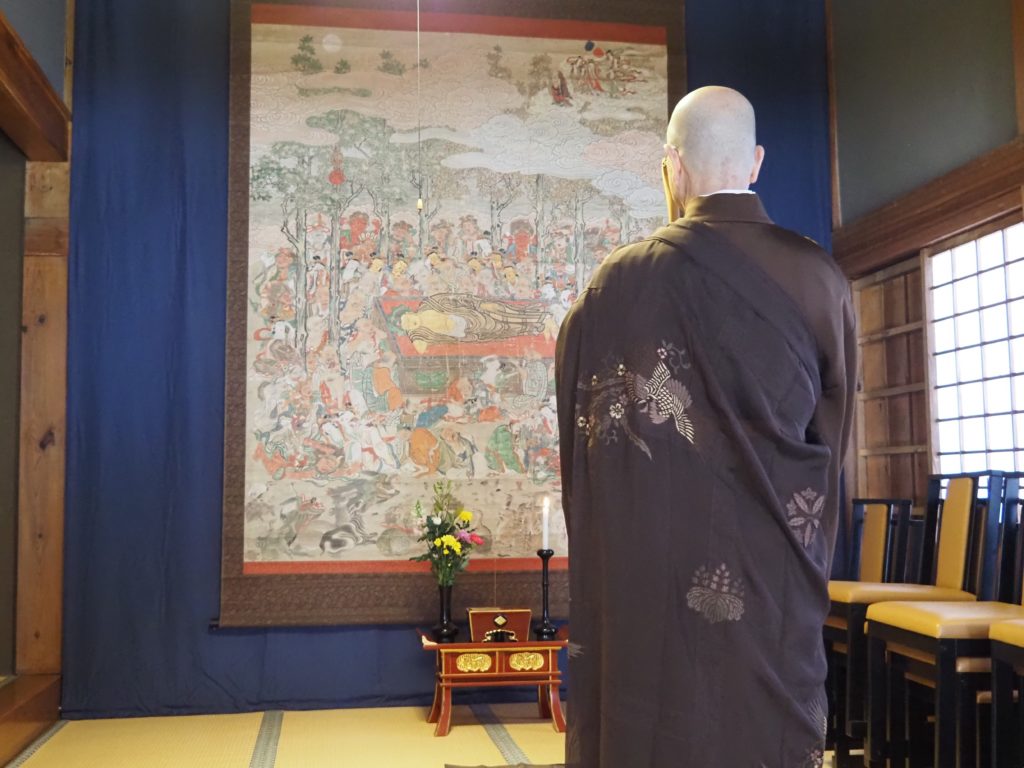 2026年2月15日 涅槃会(ねはんえ)をおつとめしました 2月15日は涅槃会(ねはんえ、お釈迦様のご命日)。2月1日から本堂東の間に涅槃図を掲げて毎日法要を重ね、15日に本尊様前にて本法要をおつとめします。 涅槃図